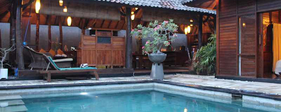 Your second home with communal living designed in a very clever way, if you want to relax you can laze around the pool or retreat to your bedroom, watch TV in the large wooden joglo, (Where breakfast is served) all only 50m from a clear blue sea on Trawangan paradise island. Every peice of material for the building is a work of art, the furniture is made from the finest quality antique wood, using top quality timber from old phinisi boats, wooden Javanese houses and recycled antique woods that are well over 100 years old. CLICK HERE TO HAVE BEST OFFER AND INSTANT CONFIRMATION.